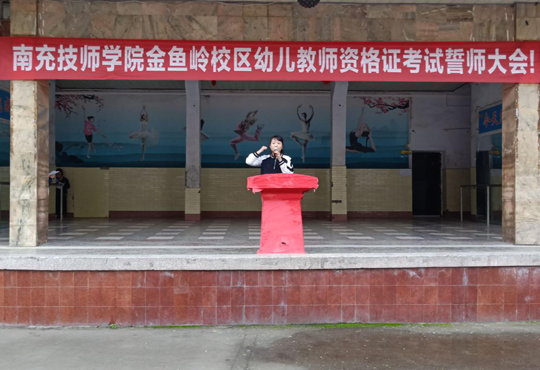为了进一步激发师生迎战国考、决胜国考的斗志,挖掘蕴藏在每一位师生内心深处的潜能,更加充分地调动备战2018国家幼儿教师资格证考试的积极性。2018年10月15日8点10分,南充技师学院金鱼岭校区隆重举行了“2018年国家幼儿教师资格证誓师动员大会”。