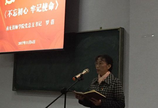 南充技师学院党总支书记罗蓓就如何在南充技师学院全体教职员工及学生中学习、宣传、贯彻党的十九大精神作了安排,她强调,学习领会党的十九大精神,关键是要深入把握“五个最”的精神实质: 一是要深入把握“始终突出习近平总书记的核心地位”这个最鲜明的特点。二是要深入把握“庄严宣告中国特色社会主义进入新时代”这个最重大的判断。三是要深入把握“确立了习近平新时代中国特色社会主义思想的指导地位”这个最伟大的贡献。四是要深入把握”“开启全面建设社会主义现代化国家新征途”这个最有力的号召。五是要深入把握“宣示全面从严治党永远在路上”这个最强烈的信号。
